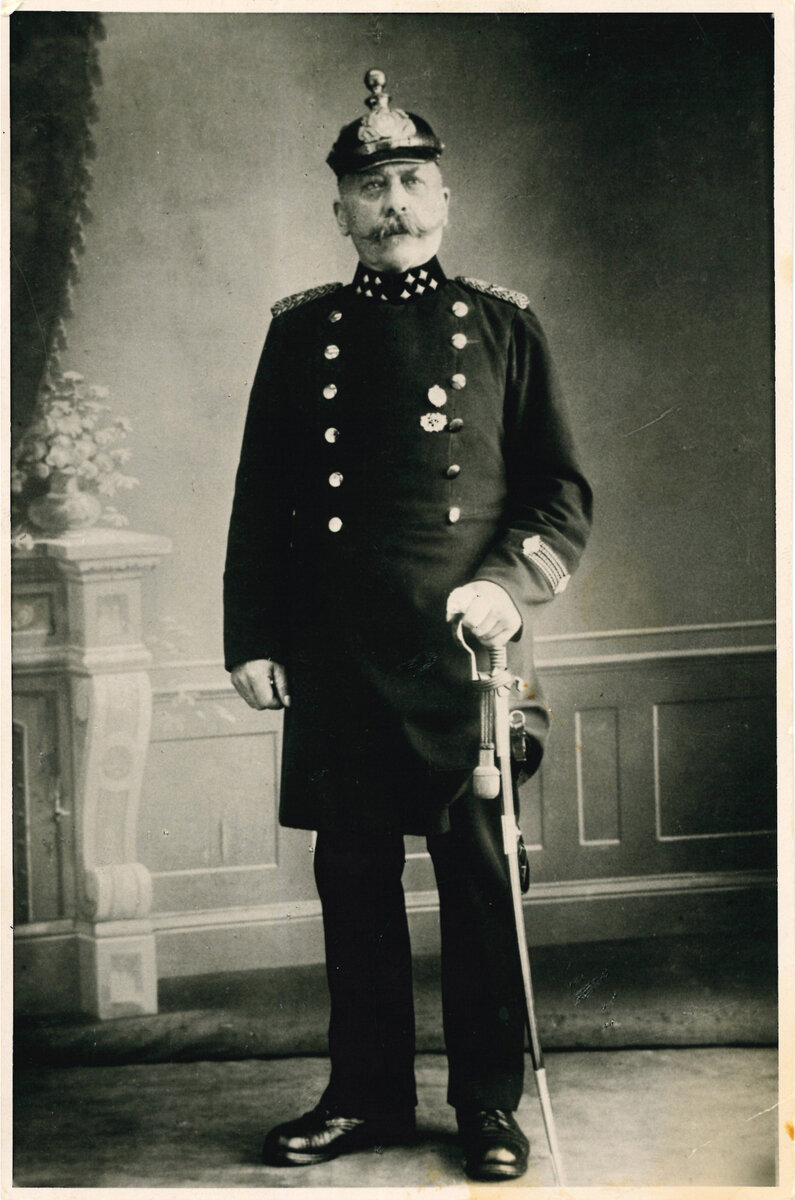 Das erste Foto zeigt den Langjährigen Hauptmann Johannes Mohr, welcher von 1896 bis 1924 der Führer der Freiwilligen Turner-Feuerwehr Itzehoe war. Zusehen ist er in seiner Dienstuniform 1924. Die Fotografie war laut des Textes auf der Rückseite ein Geschenk an Herrn P. Ohl aufgrund Mohrs Rücktritt im selben Jahr. Von diesem erhielt das Kreismuseum später dieses, sowie weitere Fotografien der Feuerwehr Itzehoe.
