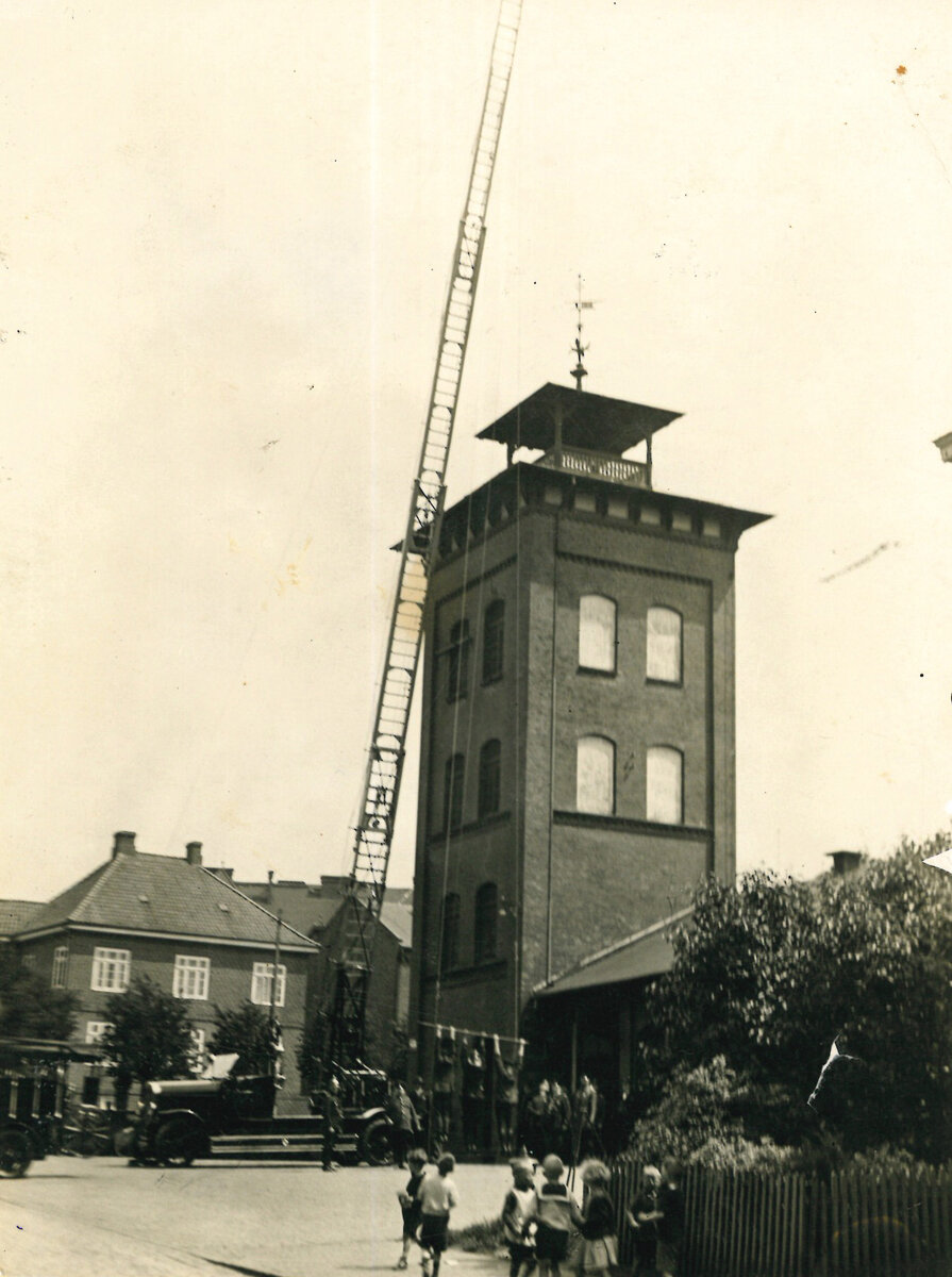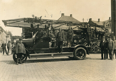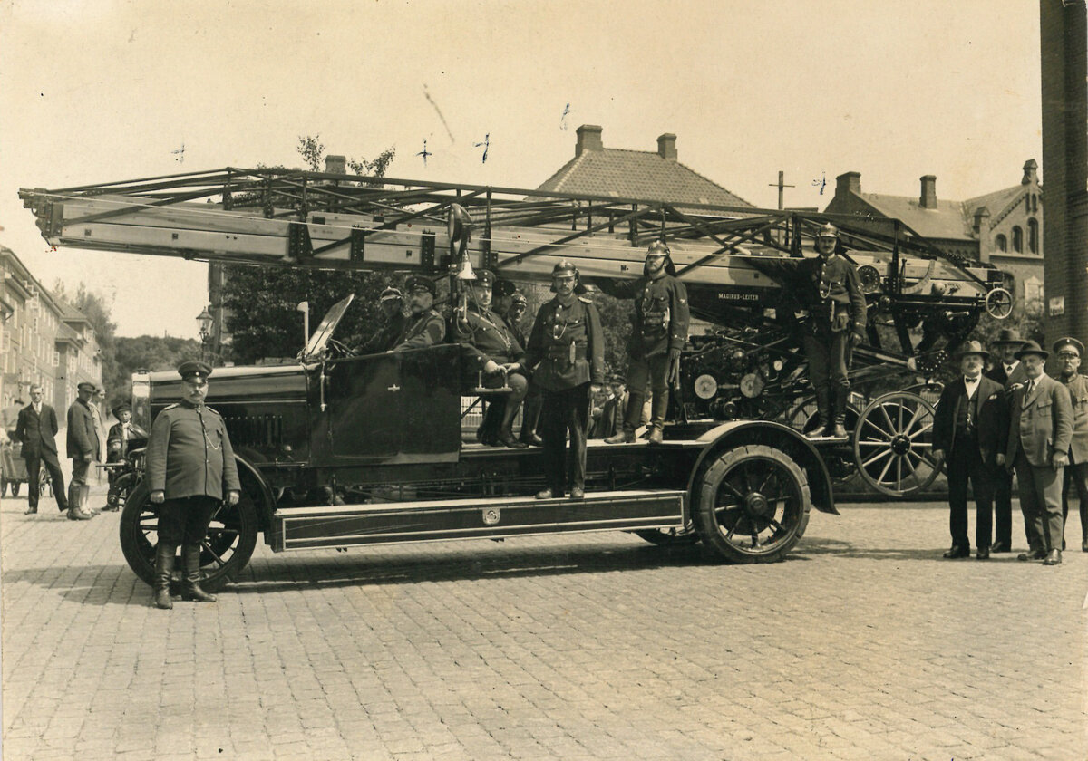 Nach dem Rücktritt des Brandmajors Mohr nahm Hauptmann Johannes Evers seinen Platz ein. In den folgenden Jahren wurde die Wehr unter seiner Leitung zügig motorisiert und 1927 stand die Anschaffung einer Drehleiter an. Die Übernahme dieser ist auf dem zweiten Foto zu sehen. Die Drehleiter wurde im Jahr 1927 von C.D. Magirus AG, Ulm a.d. Donau gebaut und hatte eine Steighöhe von 26 Metern. Um 1927 wurde ebenfalls das dritte Foto aufgenommen. Auf diesem ist die ausgefahrene Drehleiter vor dem Schlauchturm des Feuerwehrgerätehauses in der Hindenburg Straße abgebildet.