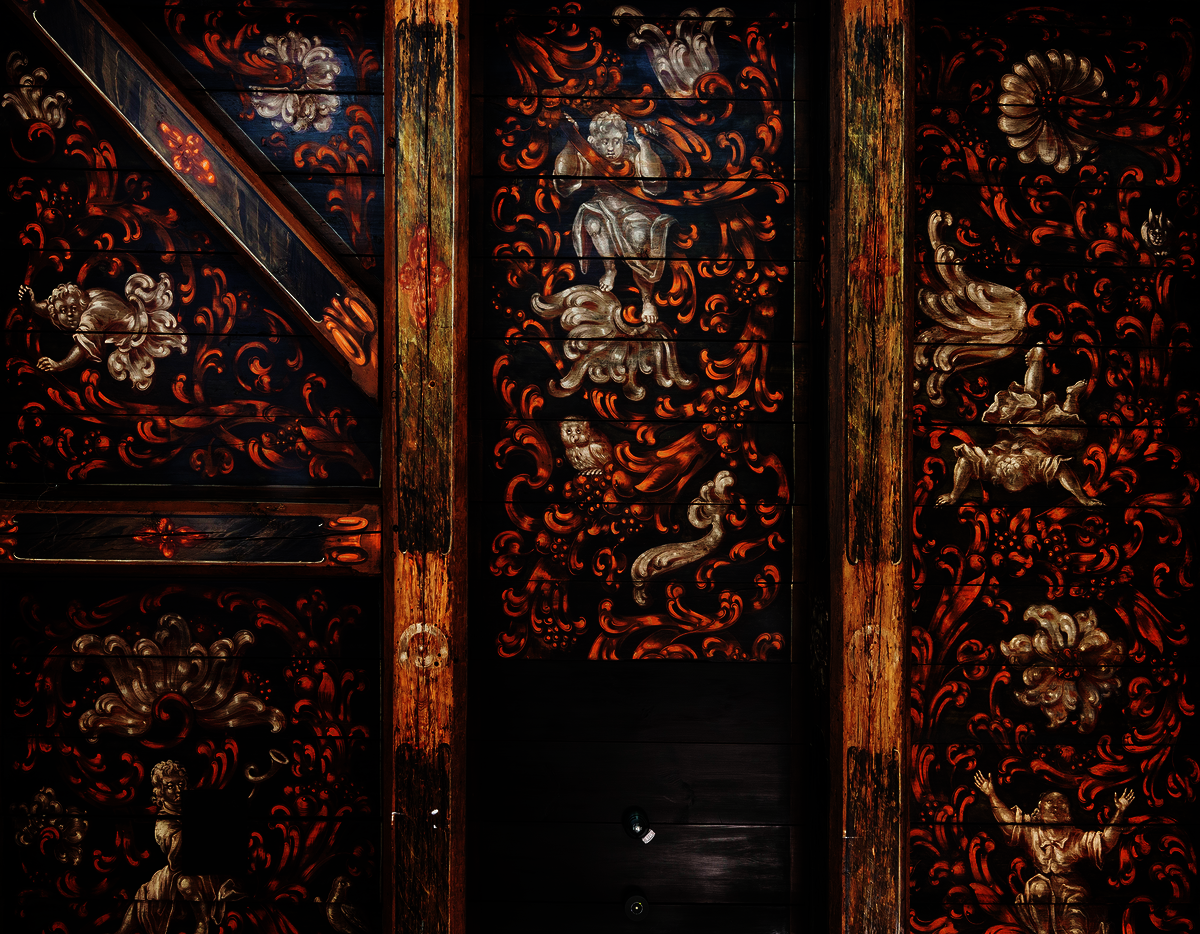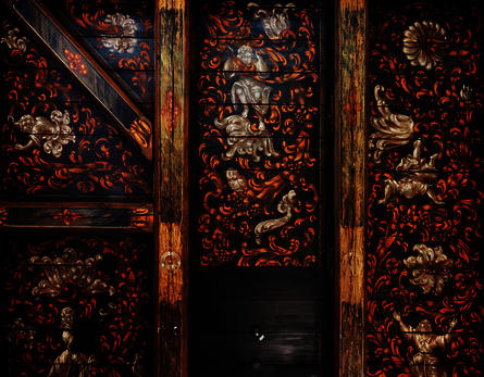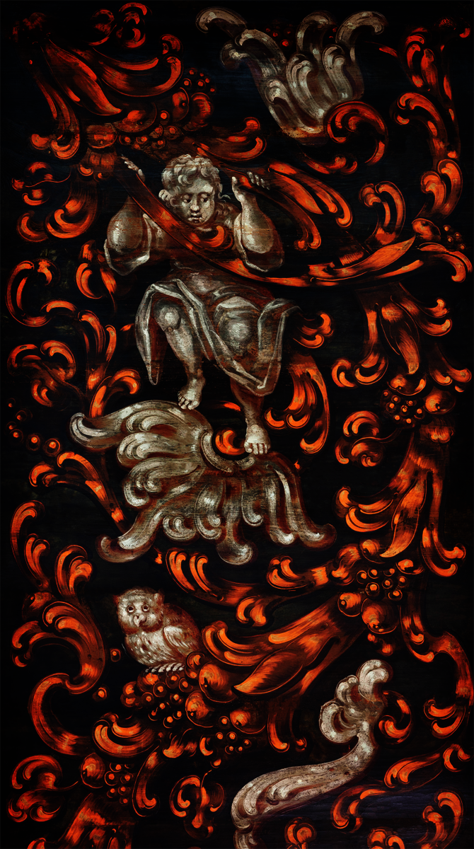 Eine der Decken ist figürlich gestaltet und zeigt auf dunklem Grund ein lebendiges Geflecht aus orangefarbenem Rankenwerk, durchzogen von Früchten, weißen Blättern und großen Blumen. In dieses Blattwerk sind mehrere Knabenfiguren eingebunden: Sie klettern, musizieren, stürzen und fangen einander auf. Ergänzt wird die Szenerie durch Tierdarstellungen wie eine Eule und einen Hasen. Die Darstellung wirkt spielerisch und zugleich erzählerisch – fast wie ein eingefrorener Moment voller Bewegung und Spannung. Die beiden anderen erhaltenen Decken sind dagegen rein ornamental gestaltet.